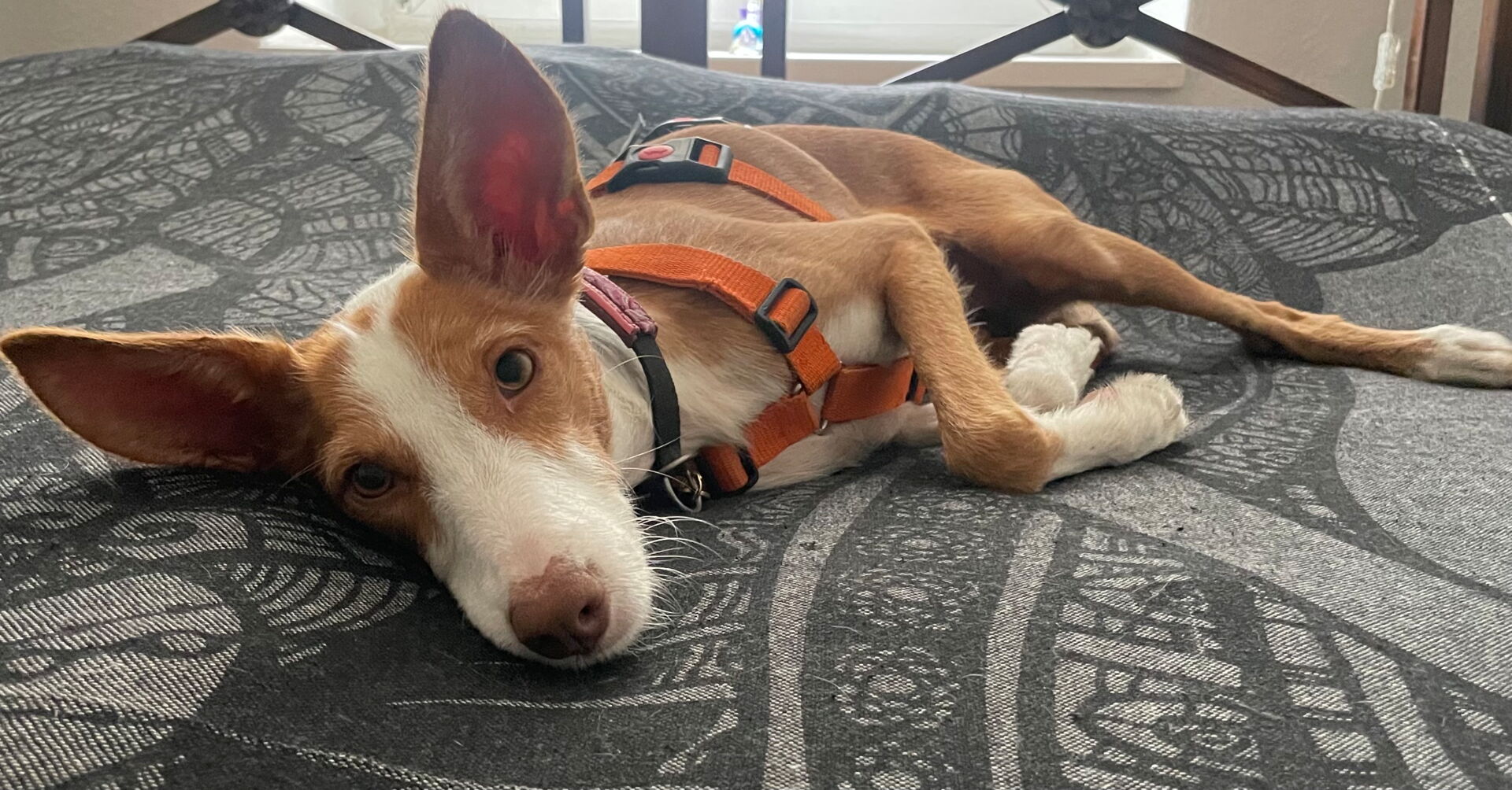 An meiner Seite ist meine junge Assistenzhündin Sally aus dem spanischen Tierschutz.